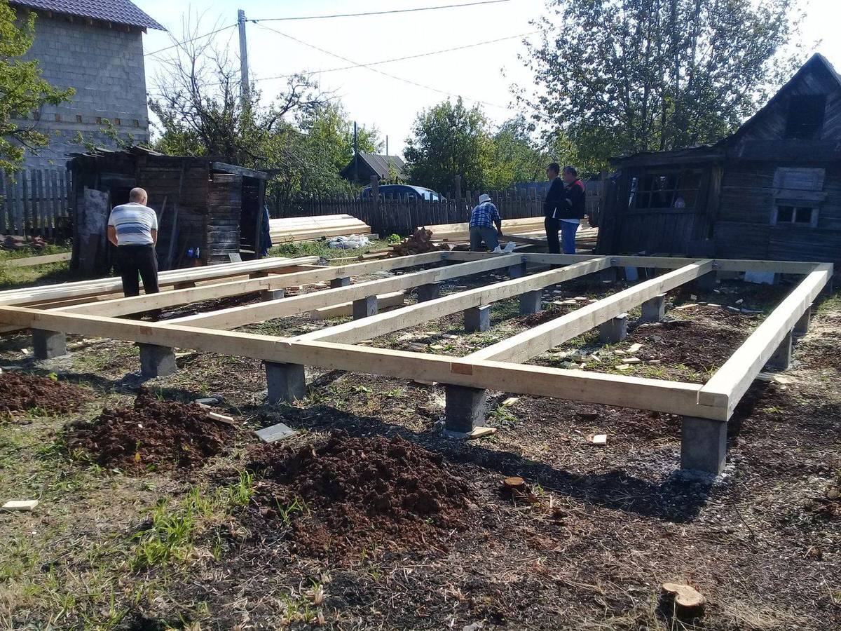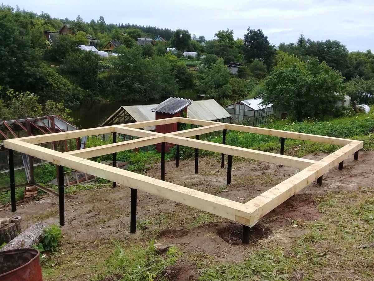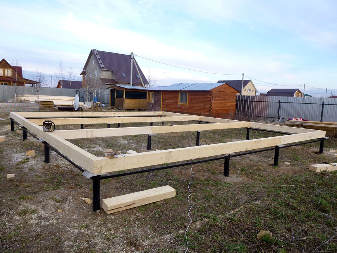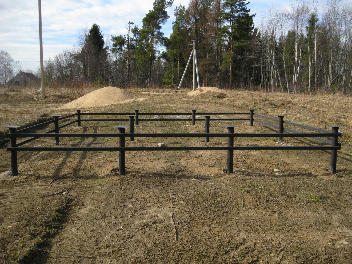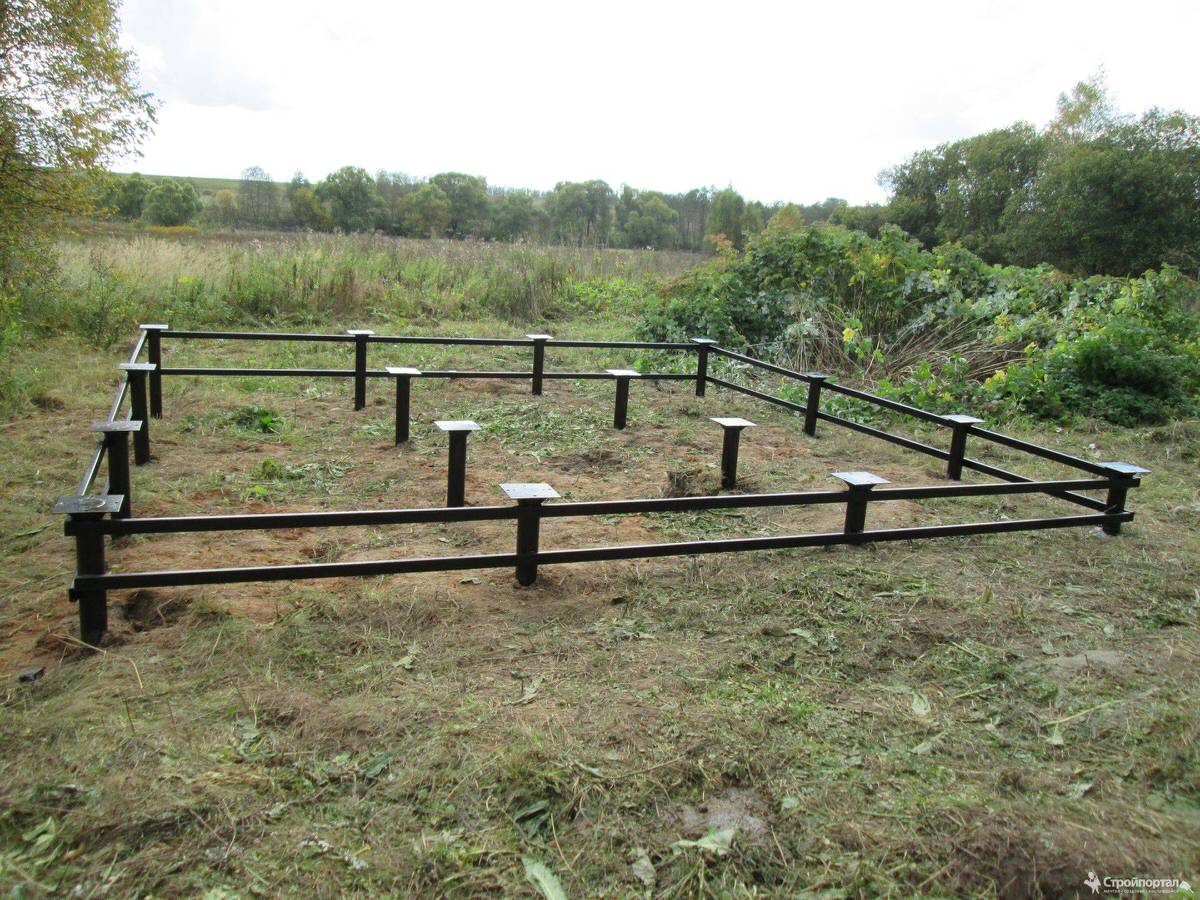 Обрабатываем сварные швы антикоррозийной краской. Ставим ростверк из бруса, металла или бетона.